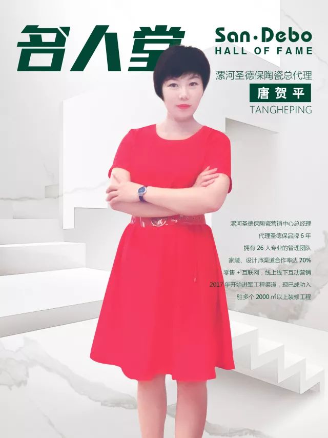 從7月起,圣德保將陸續(xù)推出一系列的經(jīng)銷商采訪報道——《名人堂》,傾聽聲音,總結(jié)經(jīng)驗,互相學(xué)習(xí),共同成長。第一期《名人堂》,我們有幸采訪到漯河圣德保陶瓷營銷中心總經(jīng)理唐賀平女士。