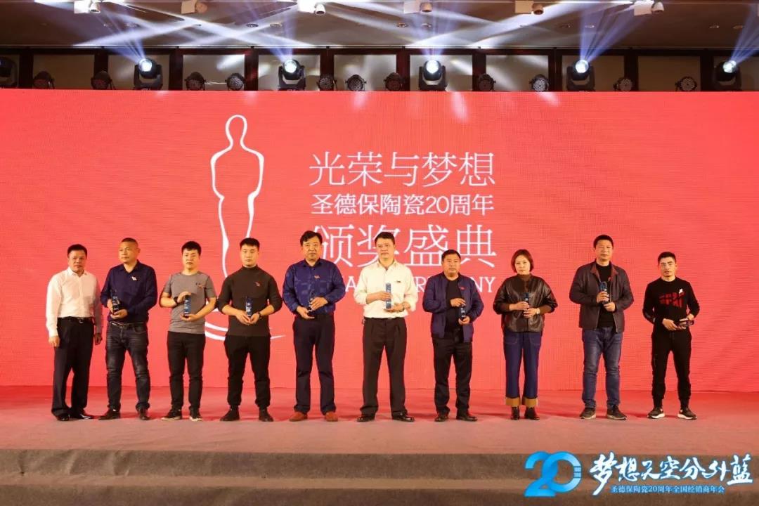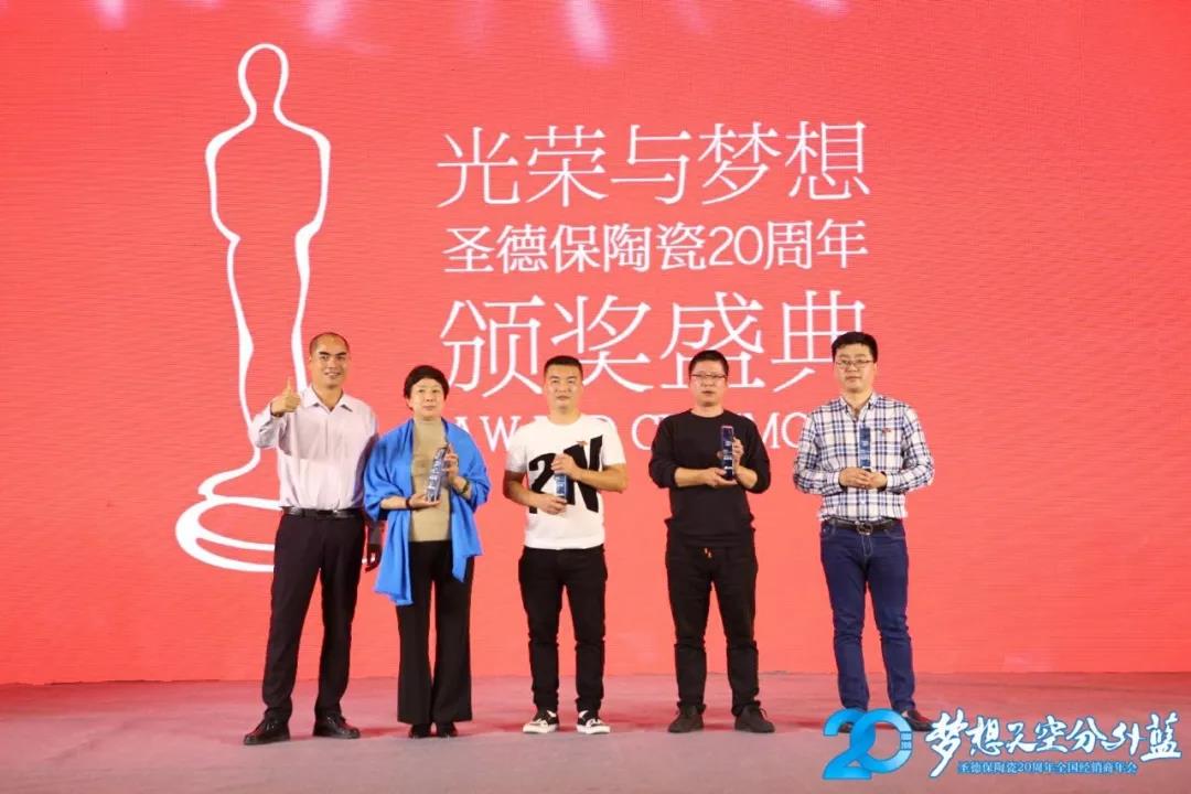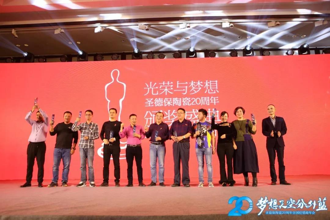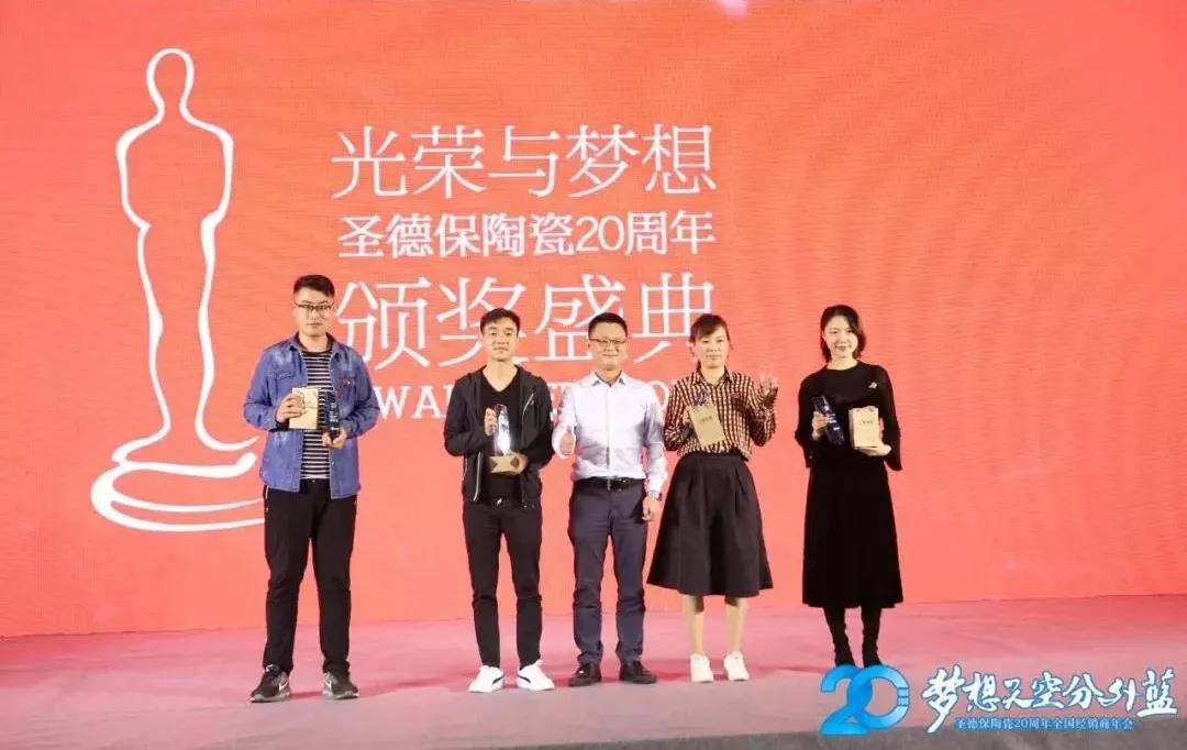 晚宴上,圣德保對2018年中在店面建設(shè)、創(chuàng)新經(jīng)營、創(chuàng)新服務(wù)上取得傲人佳績的經(jīng)銷商、導(dǎo)購員、駐店設(shè)計(jì)師頒發(fā)《光榮與夢想》圣德保陶瓷20周年年度風(fēng)云人物榮譽(yù)大獎(jiǎng),以表彰他們的成績,樹標(biāo)桿,表先進(jìn),鼓勵(lì)全體家人為夢想揚(yáng)起風(fēng)帆,砥礪前行。